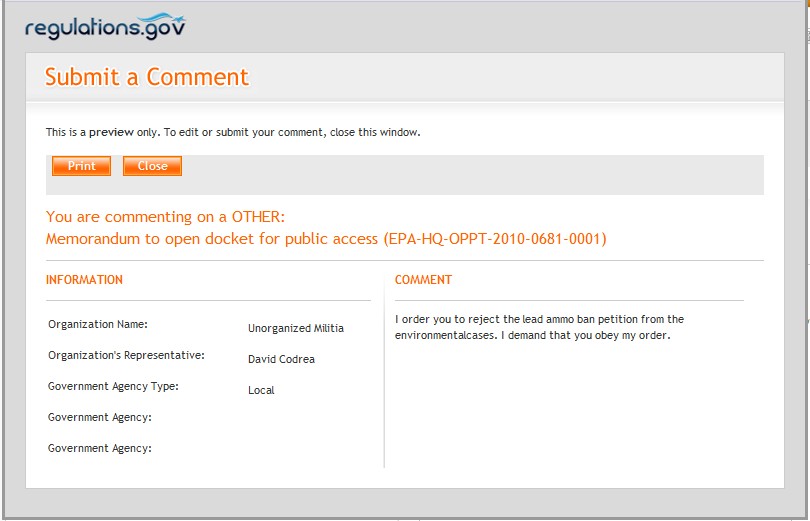 Legalistic arguments aside, the answer from the gun owner community must be a resounding and defiant "No!" [More]Today's Gun Rights Examiner column asks gun owners to get the lead out and tell EPA they will not be getting the lead out.