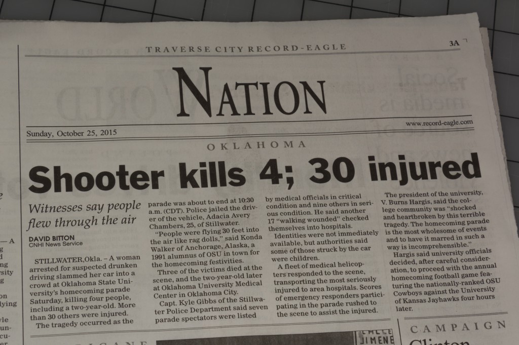 'Drunk' woman, 25, arrested after plowing her car at high speed into the Oklahoma State University homecoming parade crowd, killing three people and hospitalizing 22 [More]That does it. I'm writing my representatives and demanding we start licensing drivers and registering cars.